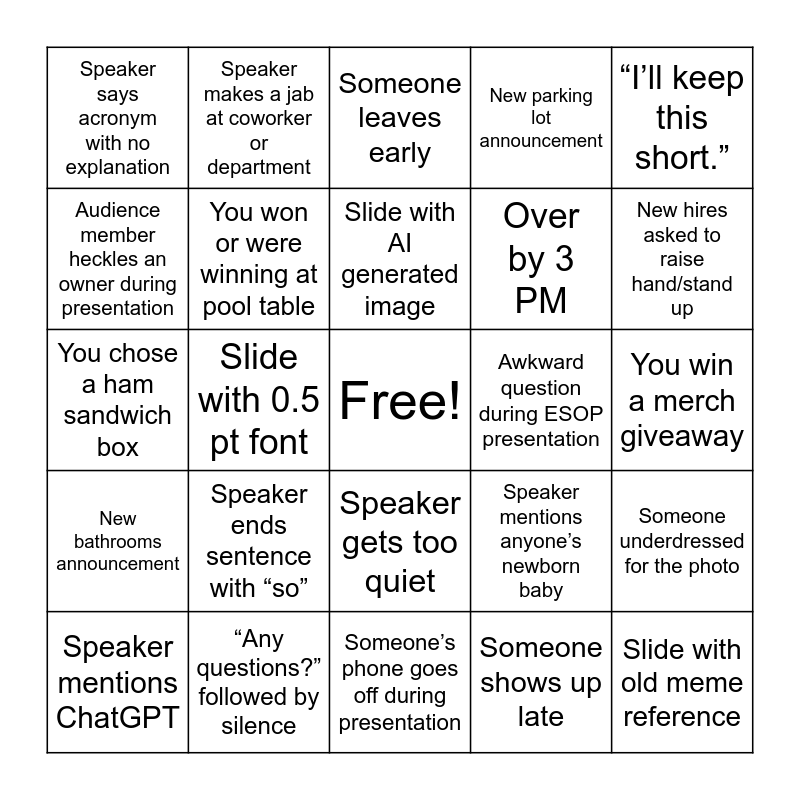 This bingo card has a free space and 24 words: Speaker ends sentence with “so”, “Any questions?” followed by silence, Slide with AI generated image, Speaker mentions ChatGPT, “I’ll keep this short.”, Speaker says acronym with no explanation, Audience member heckles an owner during presentation, Speaker makes a jab at coworker or department, Awkward question during ESOP presentation, Speaker gets too quiet, Over by 3 PM, You chose a ham sandwich box, Speaker mentions anyone’s newborn baby, Someone underdressed for the photo, You won or were winning at pool table, Someone shows up late, You win a merch giveaway, Someone leaves early, New hires asked to raise hand/stand up, Slide with 0.5 pt font, Slide with old meme reference, New bathrooms announcement, New parking lot announcement and Someone’s phone goes off during presentation.