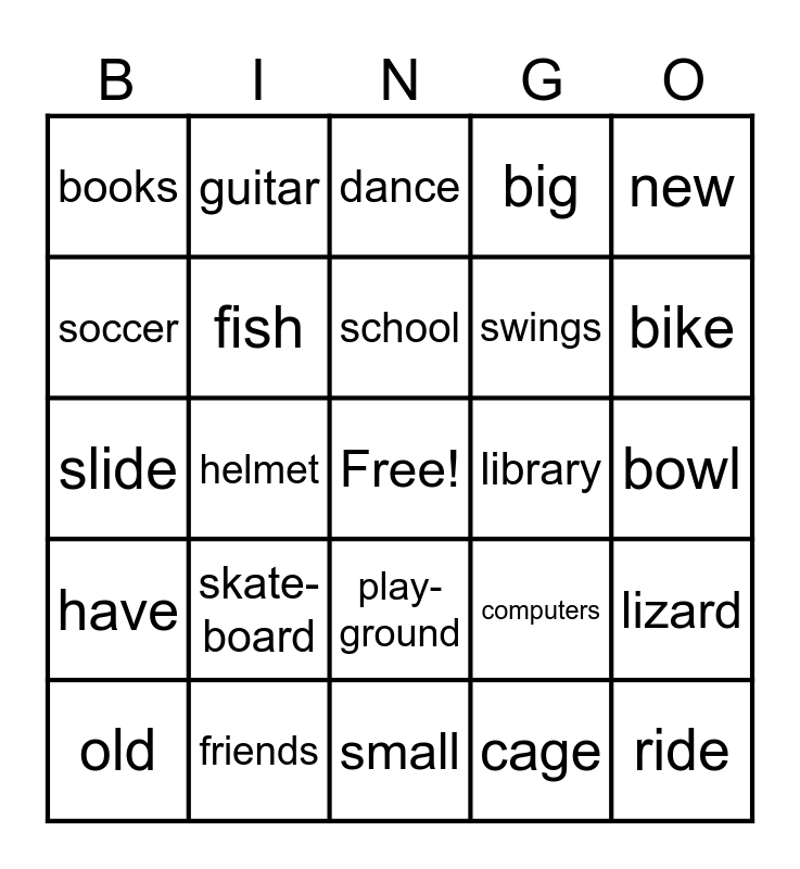 This bingo card has a free space and 24 words: skate-board, friends, school, old, new, books, soccer, guitar, library, play-ground, swings, slide, computers, lizard, fish, cage, bowl, dance, bike, helmet, ride, have, big and small.