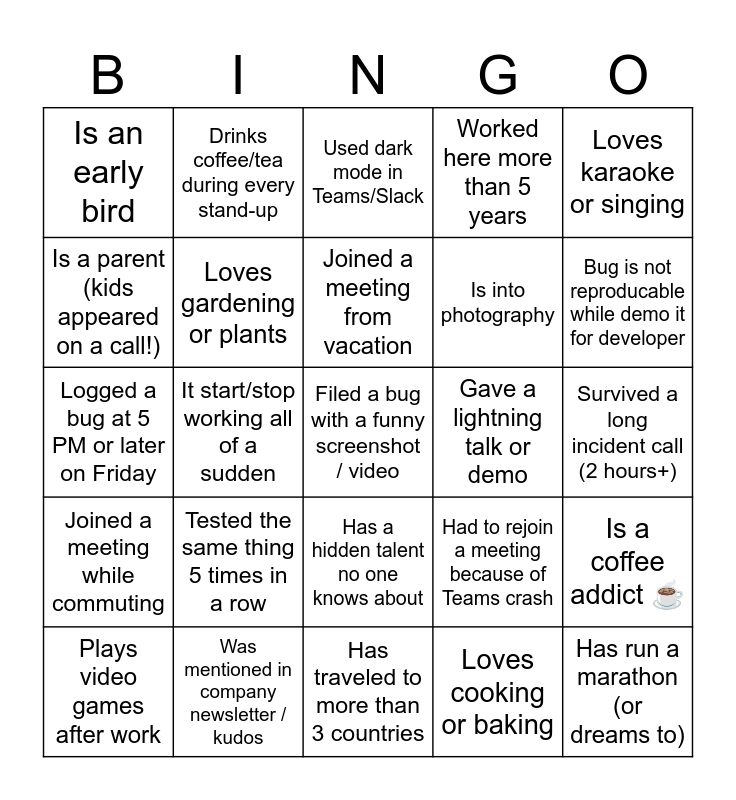 This bingo card has 45 words: Saw a ticket with zero acceptance criteria, Filed a bug with a funny screenshot / video, Tested production by accident, Plays video games after work, Joined company during the pandemic, Loves cooking or baking, Used dark mode in Teams/Slack, Has a pet who appeared in a call, Loves karaoke or singing, Was mentioned in company newsletter / kudos, Worked here more than 5 years, Gave a lightning talk or demo, Has a hidden talent no one knows about, Tested the same thing 5 times in a row, Is a night owl, Has traveled to more than 3 countries, Took already used env and broke it, Logged a bug at 5 PM or later on Friday, Speaks more than 3 languages, Bug is not reproducable while demo it for developer, Drinks coffee/tea during every stand-up, Passed the story but forgot about recording or screenshots, Found a bug by pure luck, Is an early bird, Has their camera off in meetings (sometimes 🙃), Survived a long incident call (2 hours+), Shared a funny meme in team chat, Forgot to mute during a meeting, Had to rejoin a meeting because of Teams crash, Joined a meeting while commuting, Loves hiking or outdoor adventures, Is a coffee addict ☕, During a meeting said just "Hello" and "Bye", Loves board games, Collects something unusual, It start/stop working all of a sudden, Survived back-to-back calls without lunch, Plays a musical instrument, Has run a marathon (or dreams to), Joined a meeting from vacation, Is a parent (kids appeared on a call!), Is into photography, Loves work here ❤️, Loves gardening or plants and Has tried extreme sports (skiing, skydiving, diving…).
