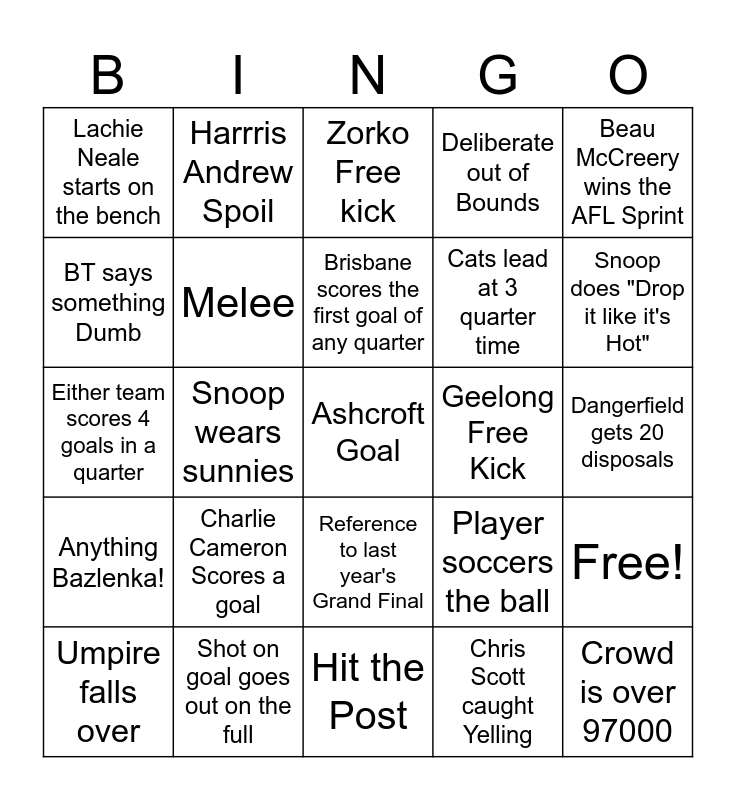This bingo card has 50 words: Dangerfield Scores a Goal, Ashcroft Goal, Score Review, Hit the Post, Charlie Cameron Scores a goal, Free Kick Dangerfield, Harrris Andrew Spoil, Brownlow Reference, BT says something Dumb, Sub Made, Melee, Deliberate out of Bounds, Free!, Player soccers the ball, Jeremy Cameron Scores, One team over 20 points in the first quarter, Brisbane scores the first goal of any quarter, Geelong Free Kick, Speccy!, Beau McCreery wins the AFL Sprint, Snoop wears sunnies, Chris Scott caught Yelling, Lachie Neale starts on the bench, Cats lead at 3 quarter time, Someone mentions the weather, Crowd is over 97000, Snoop does "Drop it like it's Hot", Mike Brady sings "Up there Cazaly", Zorko Free kick, Reference to last year's Grand Final, Brisbane lead at half time, Cats free kick in the first 5 minutes, Goal Overturned, Any player kicks 3 goals, Shot on goal goes out on the full, Goal in the first minute of any quarter, Fagan cries, Team rushes a behind, 50m penalty, Dangerfield gets 20 disposals, Scores level, High Tackle, Umpire recalls a bounce, BT says "Oh Boy", Umpire falls over, Either team scores 4 goals in a quarter, Celebrity Spotted, 20 point margin at any time, Anything Bazlenka! and Lachie Neale Goal!.