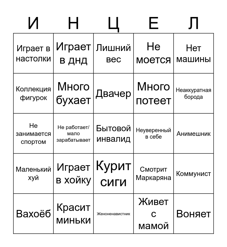 This bingo card has a free space and 24 words: Вахоёб, Играет в хойку, Двачер, Живет с мамой, Нет машины, Играет в настолки, Играет в днд, Лишний вес, Неуверенный в себе, Анимешник, Не занимается спортом, Много бухает, Смотрит Маркаряна, Коммунист, Коллекция фигурок, Красит миньки, Женоненавистник, Не моется, Неаккуратная борода, Маленький хуй, Не работает/мало зарабатывает, Курит сиги, Много потеет and Воняет.
