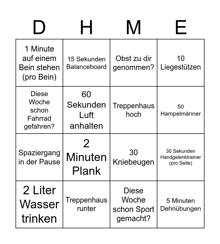 This bingo card has 16 words: Treppenhaus runter, 30 Sekunden Handgelenktrainer (pro Seite), Obst zu dir genommen?, 1 Minute auf einem Bein stehen (pro Bein), Spaziergang in der Pause, 15 Sekunden Balanceboard, 30 Kniebeugen, Diese Woche schon Sport gemacht?, Diese Woche schon Fahrrad gefahren?, 60 Sekunden Luft anhalten, 2 Liter Wasser trinken, 10 Liegestützen, 2 Minuten Plank, 50 Hampelmänner, Treppenhaus hoch and 5 Minuten Dehnübungen.