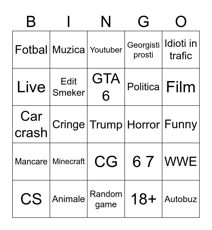 This bingo card has a free space and 24 words: Minecraft, Animale, GTA 6, CS, Idioti in trafic, Fotbal, Live, Muzica, Horror, CG, Politica, Car crash, 6 7, WWE, Edit Smeker, 18+, Funny, Youtuber, Film, Cringe, Autobuz, Mancare, Georgisti prosti and Random game.