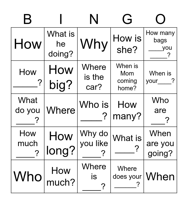 This bingo card has 29 words: Who, What, Where, When, How, Why, How big?, How long?, How many?, How much?, Who are ___?, Who is ____?, Where is ____?, Where does your ______?, When is your____?, When do you _____?, Why do you like ____?, How much ____?, How many bags ____you _____?, What do you ____?, What is ____?, Where are _____?, When is Mom coming home?, How _____?, How is she?, What is he doing?, When are you going?, Where is the car? and What is your favorite song?.