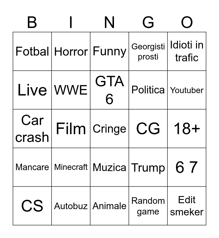 This bingo card has 25 words: Minecraft, Animale, GTA 6, CS, Idioti in trafic, Fotbal, Live, Horror, CG, Muzica, Politica, Car crash, Trump, 6 7, WWE, Edit smeker, 18+, Funny, Youtuber, Film, Cringe, Autobuz, Mancare, Georgisti prosti and Random game.