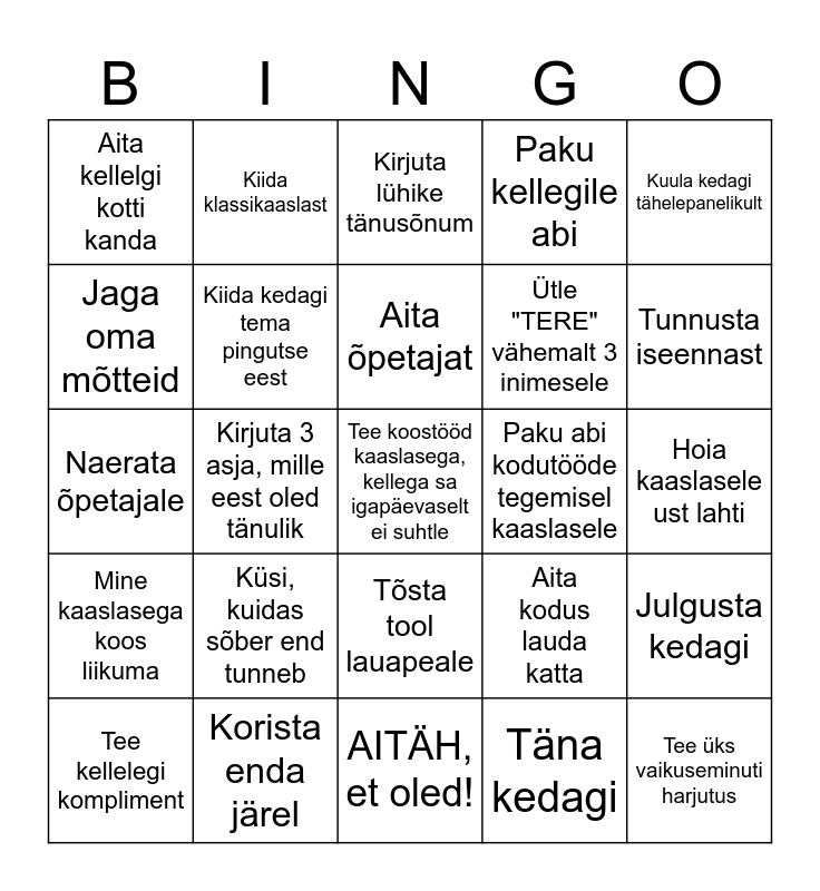 This bingo card has a free space and 24 words: Küsi, kuidas sõber end tunneb, Korista enda järel, Aita õpetajat, Tee kellelegi kompliment, Kuula kedagi tähelepanelikult, Aita kellelgi kotti kanda, Jaga oma mõtteid, Kiida klassikaaslast, Paku abi kodutööde tegemisel kaaslasele, Tõsta tool lauapeale, Ütle "TERE" vähemalt 3 inimesele, Naerata õpetajale, Aita kodus lauda katta, Julgusta kedagi, Kiida kedagi tema pingutse eest, Täna kedagi, Hoia kaaslasele ust lahti, Kirjuta lühike tänusõnum, Tunnusta iseennast, Kirjuta 3 asja, mille eest oled tänulik, Tee üks vaikuseminuti harjutus, Mine kaaslasega koos liikuma, Paku kellegile abi and AITÄH, et oled!.