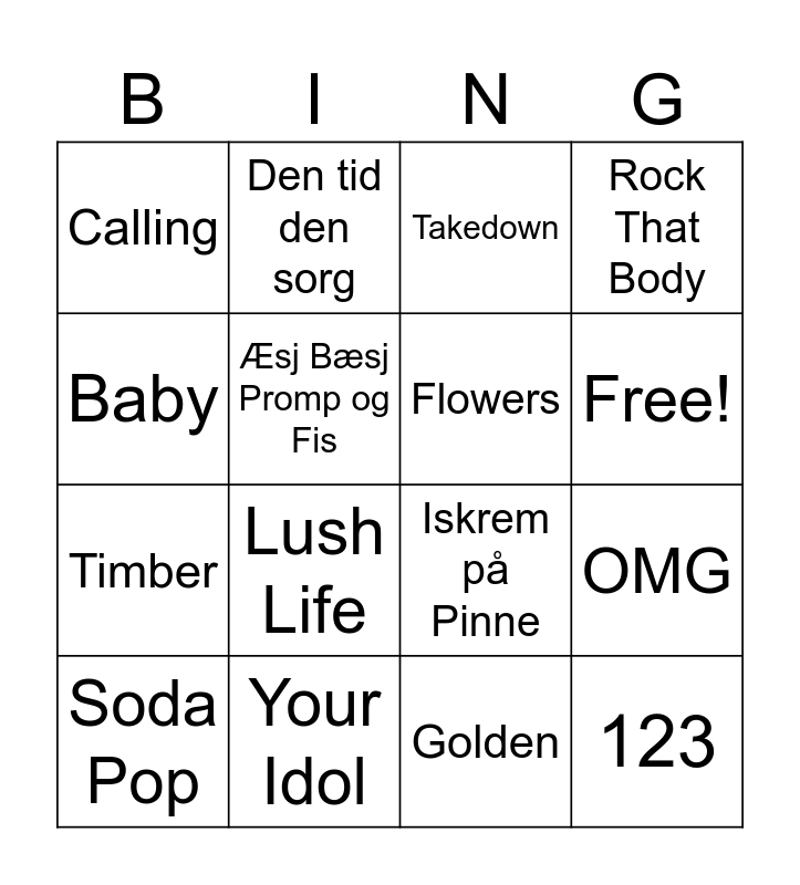 This bingo card has 17 words: Golden, Soda Pop, Takedown, Calling, Lush Life, Rock That Body, OMG, Flowers, Free!, Æsj Bæsj Promp og Fis, Your Idol, Iskrem på Pinne, Baby, Den tid den sorg, Timber, Too Sweet and 123.
