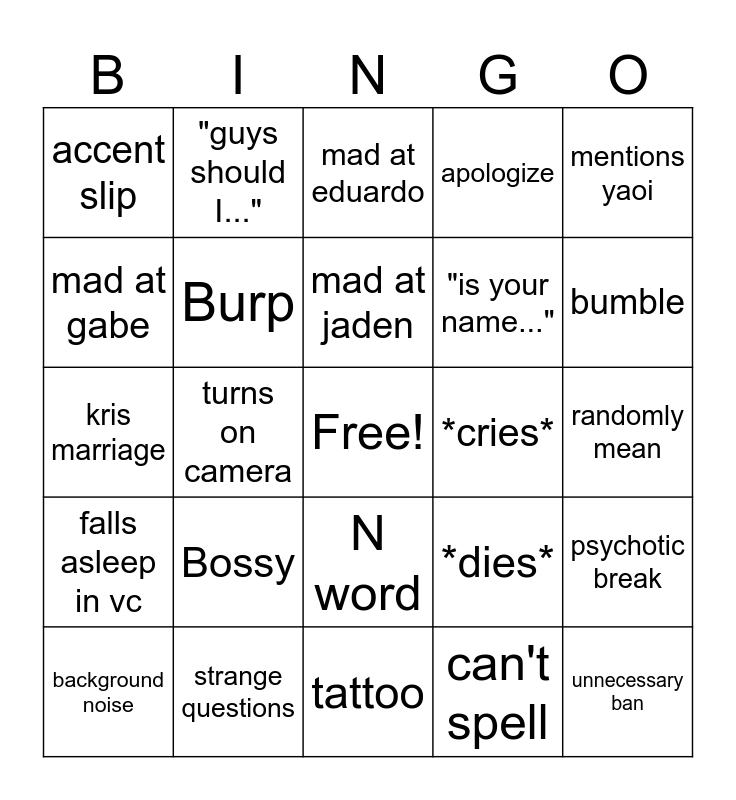 This bingo card has a free space and 24 words: Bossy, strange questions, mad at jaden, background noise, mentions yaoi, accent slip, mad at gabe, "guys should I...", *cries*, N word, "is your name...", kris marriage, *dies*, psychotic break, Burp, can't spell, randomly mean, mad at eduardo, bumble, turns on camera, unnecessary ban, falls asleep in vc, apologize and tattoo.