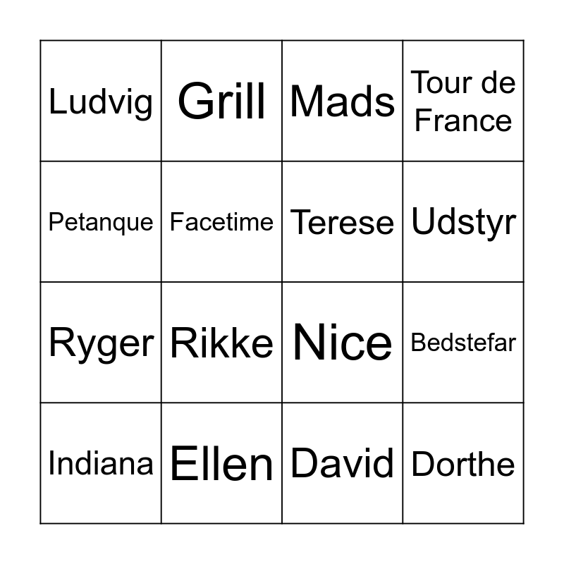 This bingo card has 31 words: Lars, 70, Bedstefar, Artur, Ludvig, Mads, Terese, Lauritz, Ellen, Monica, David, Indiana, Nora, Luna, Rikke, Thomas, Anette, Burim, Dorthe, Moster Ib, Petanque, Cykling, Heppekors, Grill, Ryger, Facetime, Tour de France, Nice, Molbo, Udstyr and Venner.