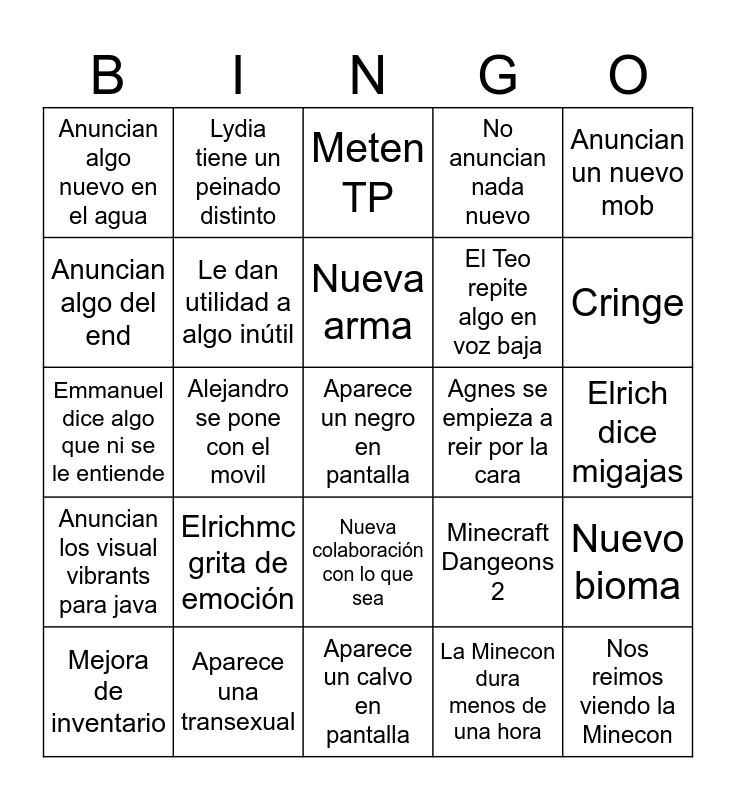 This bingo card has 25 words: Elrichmc grita de emoción, Aparece un calvo en pantalla, Nueva arma, Mejora de inventario, Anuncian un nuevo mob, Anuncian algo nuevo en el agua, Anuncian algo del end, Lydia tiene un peinado distinto, Agnes se empieza a reir por la cara, Nueva colaboración con lo que sea, El Teo repite algo en voz baja, Emmanuel dice algo que ni se le entiende, Minecraft Dangeons 2, Nuevo bioma, Le dan utilidad a algo inútil, Nos reimos viendo la Minecon, Elrich dice migajas, Meten TP, Cringe, Alejandro se pone con el movil, Aparece un negro en pantalla, Aparece una transexual, Anuncian los visual vibrants para java, No anuncian nada nuevo and La Minecon dura menos de una hora.