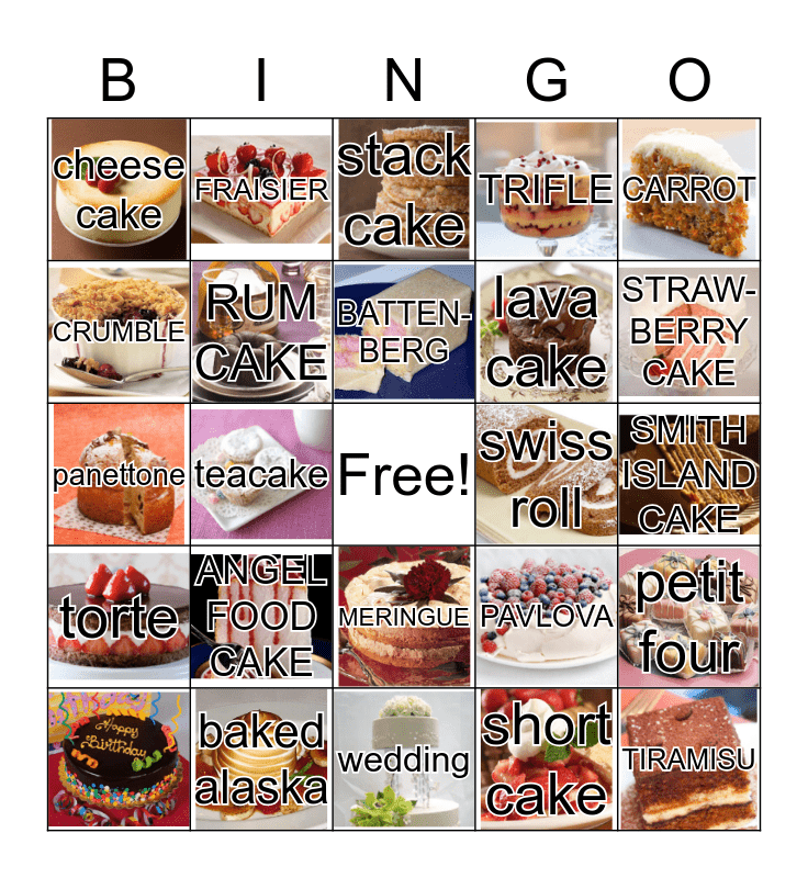 This bingo card has 24 images, a free space and 23 words: ANGEL FOOD CAKE, baked alaska, BATTEN-BERG, CARROT, cheese cake, CRUMBLE, FRAISIER, swiss roll, MERINGUE, lava cake, panettone, PAVLOVA, petit four, RUM CAKE, short cake, SMITH ISLAND CAKE, stack cake, STRAW-BERRY CAKE, teacake, TIRAMISU, torte, TRIFLE and wedding.