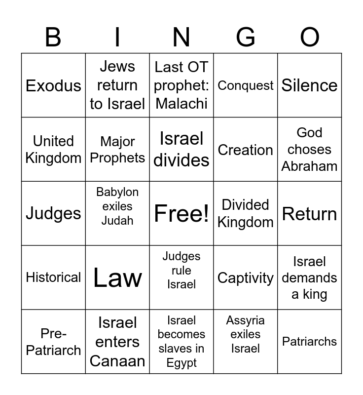 This bingo card has a free space and 26 words: Judges rule Israel, Assyria exiles Israel, Israel divides, Israel enters Canaan, Silence, Exodus, United Kingdom, Jews return to Israel, Return, Captivity, Creation, Judges, Israel demands a king, Pre-Patriarch, Babylon exiles Judah, Poetry/Wisdom, Conquest, Historical, Last OT prophet: Malachi, Patriarchs, God choses Abraham, Israel becomes slaves in Egypt, Divided Kingdom, Law, Major Prophets and Minor Prophets.