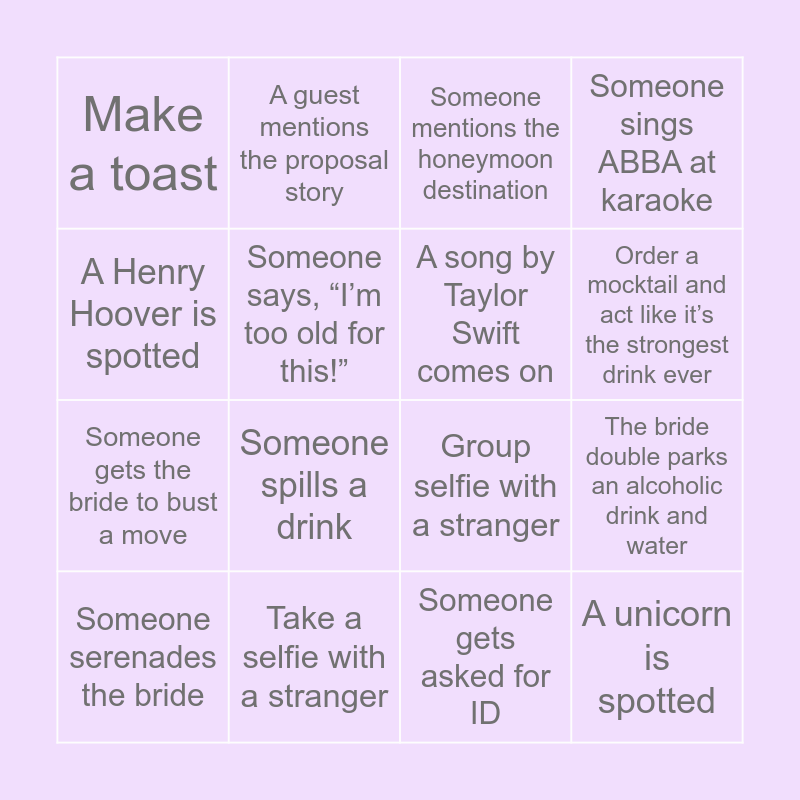 This bingo card has 41 words: Bride does a shot, Group selfie with a stranger, Someone yells “Bride-to-be!”, A song by Taylor Swift comes on, A stranger congratulates the bride without being prompted, You see a dog while you're out, Order a mocktail and act like it’s the strongest drink ever, A guest complains about England weather, A Henry Hoover is spotted, A unicorn is spotted, The bride double parks an alcoholic drink and water, Someone sings ABBA at karaoke, Someone serenades the bride, Someone gets asked for ID, Take a selfie with a stranger, Meet another Hen Party, Find a stranger with the same name as the groom, Make a toast, Bride says “I can’t believe I’m getting married”, Someone mentions the honeymoon destination, Bridesmaid shares a funny story, Someone mentions the wedding night ;), Someone talks about a memorable adventure with the bride, Someone gets the bride to bust a move, Groom’s name is mentioned more than three times, Someone mentions the colour scheme of the wedding, Bride talks about the groom, Someone compliments the brides engagement ring, Someone spills a drink, Someone offers marriage advice to the bride, Bride mentions her wedding day nerves/excitement, A guest mentions the proposal story, Someone mentions babies, The bride is called “future Mrs. Whitelegg”, Someone trips (but laughs it off), Someone says, “I’m too old for this!”, Someone tries to speak in a fake accent, Everyone sings Sweet Caroline at the top of our lungs, You spot someone in full fancy dress that’s not in your group, You win a random prize and Bride says “I’m not drunk”.