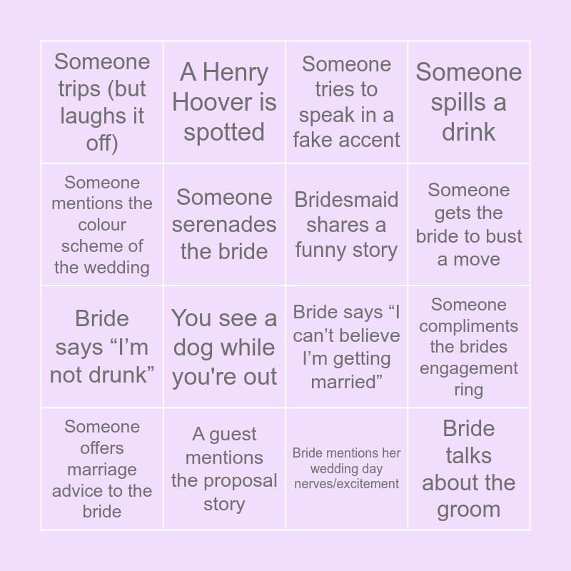 This bingo card has 41 words: Bride does a shot, Bride says “I can’t believe I’m getting married”, Someone mentions the honeymoon destination, Bridesmaid shares a funny story, Someone mentions the wedding night ;), Someone talks about a memorable adventure with the bride, Someone gets the bride to bust a move, Groom’s name is mentioned more than three times, Someone mentions the colour scheme of the wedding, Bride talks about the groom, Someone compliments the brides engagement ring, Someone spills a drink, Someone offers marriage advice to the bride, Bride mentions her wedding day nerves/excitement, A guest mentions the proposal story, Someone mentions babies, The bride is called “future Mrs. Whitelegg”, Someone trips (but laughs it off), Someone says, “I’m too old for this!”, Someone tries to speak in a fake accent, Everyone sings Sweet Caroline at the top of our lungs, You spot someone in full fancy dress that’s not in your group, You win a random prize, Bride says “I’m not drunk”, Group selfie with a stranger, Someone yells “Bride-to-be!”, A song by Taylor Swift comes on, A stranger congratulates the bride without being prompted, You see a dog while you're out, Order a mocktail and act like it’s the strongest drink ever, A guest complains about England weather, A Henry Hoover is spotted, A unicorn is spotted, The bride double parks an alcoholic drink and water, Someone sings ABBA at karaoke, Someone serenades the bride, Someone gets asked for ID, Take a selfie with a stranger, Meet another Hen Party, Find a stranger with the same name as the groom and Make a toast.