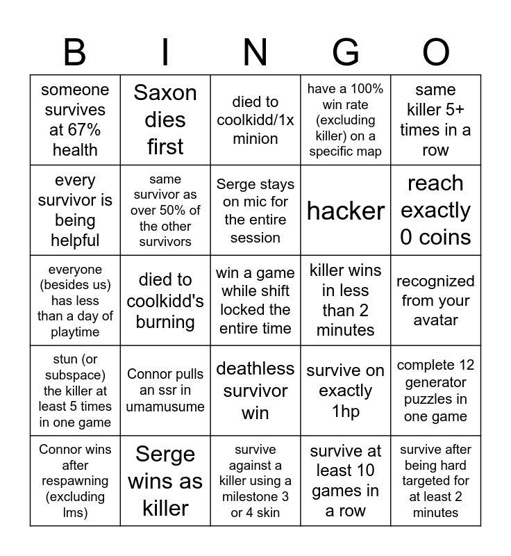 This bingo card has a free space and 24 words: Connor pulls an ssr in umamusume, Serge wins as killer, Serge stays on mic for the entire session, Connor wins after respawning (excluding lms), same killer 5+ times in a row, someone survives at 67% health, every survivor is being helpful, Saxon dies first, killer wins in less than 2 minutes, deathless survivor win, hacker, everyone (besides us) has less than a day of playtime, survive on exactly 1hp, complete 12 generator puzzles in one game, same survivor as over 50% of the other survivors, survive at least 10 games in a row, recognized from your avatar, died to coolkidd/1x minion, reach exactly 0 coins, died to coolkidd's burning, survive after being hard targeted for at least 2 minutes, stun (or subspace) the killer at least 5 times in one game, have a 100% win rate (excluding killer) on a specific map and survive against a killer using a milestone 3 or 4 skin.