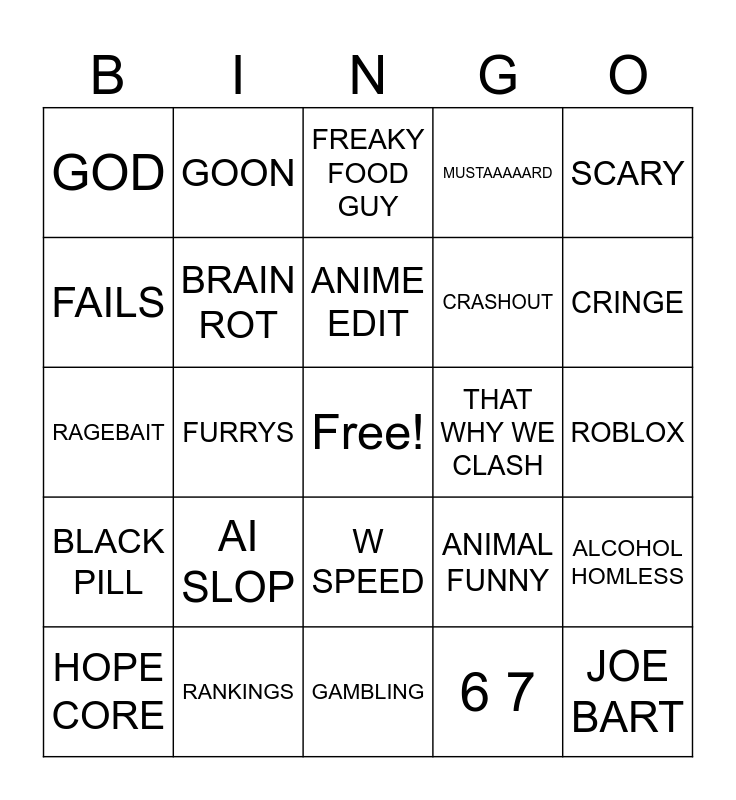 This bingo card has a free space and 24 words: AI SLOP, RANKINGS, ANIME EDIT, HOPE CORE, SCARY, GOD, FAILS, GOON, THAT WHY WE CLASH, W SPEED, CRASHOUT, RAGEBAIT, ANIMAL FUNNY, ALCOHOL HOMLESS, BRAIN ROT, 6 7, ROBLOX, FREAKY FOOD GUY, CRINGE, FURRYS, JOE BART, BLACK PILL, MUSTAAAAARD and GAMBLING.