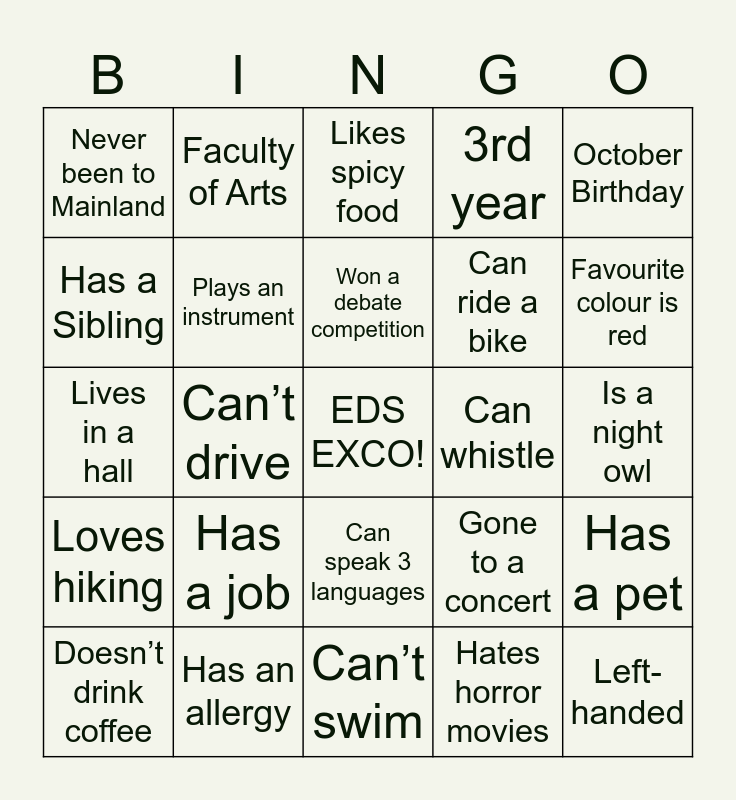 This bingo card has 25 words: Has a job, Can’t swim, Won a debate competition, Doesn’t drink coffee, October Birthday, Never been to Mainland, Has a Sibling, Faculty of Arts, Can whistle, Can speak 3 languages, Can ride a bike, Lives in a hall, Gone to a concert, Has a pet, Plays an instrument, Left-handed, Is a night owl, Likes spicy food, Favourite colour is red, Can’t drive, EDS EXCO!, Has an allergy, Loves hiking, 3rd year and Hates horror movies.