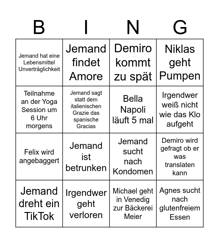 This bingo card has 16 words: Irgendwer geht verloren, Demiro wird gefragt ob er was translaten kann, Demiro kommt zu spät, Jemand hat eine Lebensmittel Unverträglichkeit, Felix wird angebaggert, Jemand findet Amore, Jemand sucht nach Kondomen, Michael geht in Venedig zur Bäckerei Meier, Teilnahme an der Yoga Session um 6 Uhr morgens, Jemand sagt statt dem italienischen Grazie das spanische Gracias, Jemand dreht ein TikTok, Niklas geht Pumpen, Jemand ist betrunken, Irgendwer weiß nicht wie das Klo aufgeht, Bella Napoli läuft 5 mal and Agnes sucht nach glutenfreiem Essen.