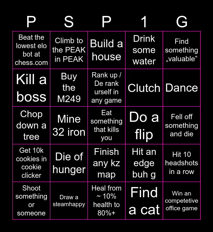 This bingo card has a free space and 24 words: Die of hunger, Draw a steamhappy, Rank up / De rank urself in any game, Shoot something or someone, Find something „valuable”, Beat the lowest elo bot at chess.com, Kill a boss, Climb to the PEAK in PEAK, Do a flip, Finish any kz map, Clutch, Chop down a tree, Hit an edge buh g, Hit 10 headshots in a row, Buy the M249, Find a cat, Fell off something and die, Build a house, Dance, Mine 32 iron, Win an competetive office game, Get 10k cookies in cookie clicker, Drink some water and Heal from ~ 10% health to 80%+.