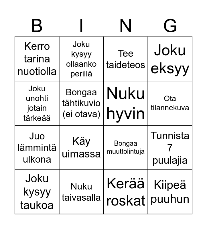 This bingo card has 18 words: Käy uimassa, Kiipeä puuhun, Tee taideteos, Kerro tarina nuotiolla, Bongaa muuttolintuja, Joku eksyy, Joku kysyy taukoa, Joku kysyy ollaanko perillä, Ota tilannekuva, Juo lämmintä ulkona, Kerää roskat, Joku unohti jotain tärkeää, Tunnista 7 puulajia, Bongaa tähtikuvio (ei otava), Nuku hyvin, Syö luonnon antimia, Nuku taivasalla and Tunnista 7 eläintä.