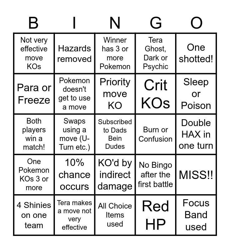 This bingo card has a free space and 24 words: 10% chance occurs, Tera makes a move not very effective, Priority move KO, 4 Shinies on one team, One shotted!, Not very effective move KOs, Para or Freeze, Hazards removed, Burn or Confusion, KO'd by indirect damage, Crit KOs, Both players win a match!, No Bingo after the first battle, MISS!!, Pokemon doesn't get to use a move, Red HP, Double HAX in one turn, Winner has 3 or more Pokemon, Sleep or Poison, Swaps using a move (U-Turn etc.), Focus Band used, One Pokemon KOs 3 or more, Tera Ghost, Dark or Psychic and All Choice Items used.