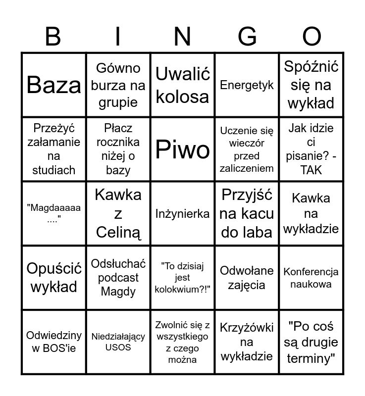 This bingo card has a free space and 24 words: Odsłuchać podcast Magdy, Niedziałający USOS, Piwo, Odwiedziny w BOS'ie, Spóźnić się na wykład, Baza, Przeżyć załamanie na studiach, Gówno burza na grupie, Przyjść na kacu do laba, "To dzisiaj jest kolokwium?!", Uczenie się wieczór przed zaliczeniem, "Magdaaaaa ....", Odwołane zajęcia, Konferencja naukowa, Płacz rocznika niżej o bazy, Krzyżówki na wykładzie, Kawka na wykładzie, Uwalić kolosa, Jak idzie ci pisanie? - TAK, Kawka z Celiną, "Po coś są drugie terminy", Opuścić wykład, Energetyk and Zwolnić się z wszystkiego z czego można.