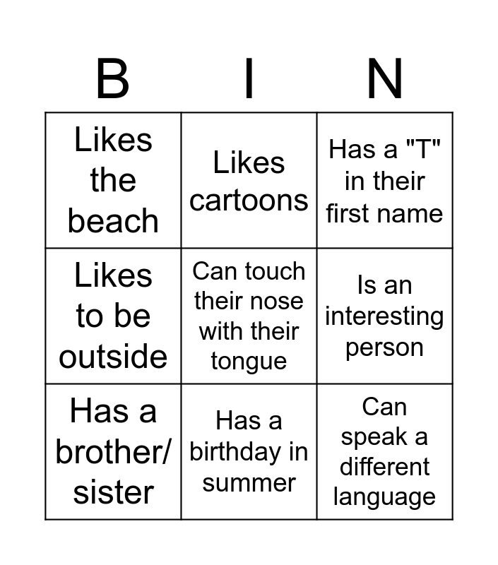 This bingo card has 36 words: Likes scary movies, Has a pet, Likes Cheese, Has a brother/ sister, (FREE), Likes Math, Has a birthday in summer, Has a birthday in winter, Can touch their nose with their tongue, Likes to read, Likes Science, Likes to be outside, Likes hamburgers, Was in another country, Wants to go to college, Likes the beach, Likes the winter, Dislikes snakes/ bugs, Does not like pizza, Has a "T" in their first name, Likes Spicy foods, Can draw, Likes to camp, Has an interesting hobby, Wears glasses, Likes cartoons, Never been on a plane, Dislikes ice cream, Can speak a different language, Is an interesting person, Is allergic to something, Has broken a bone, Likes to garden, Likes music, Does not have a cell phone and Likes to dance.