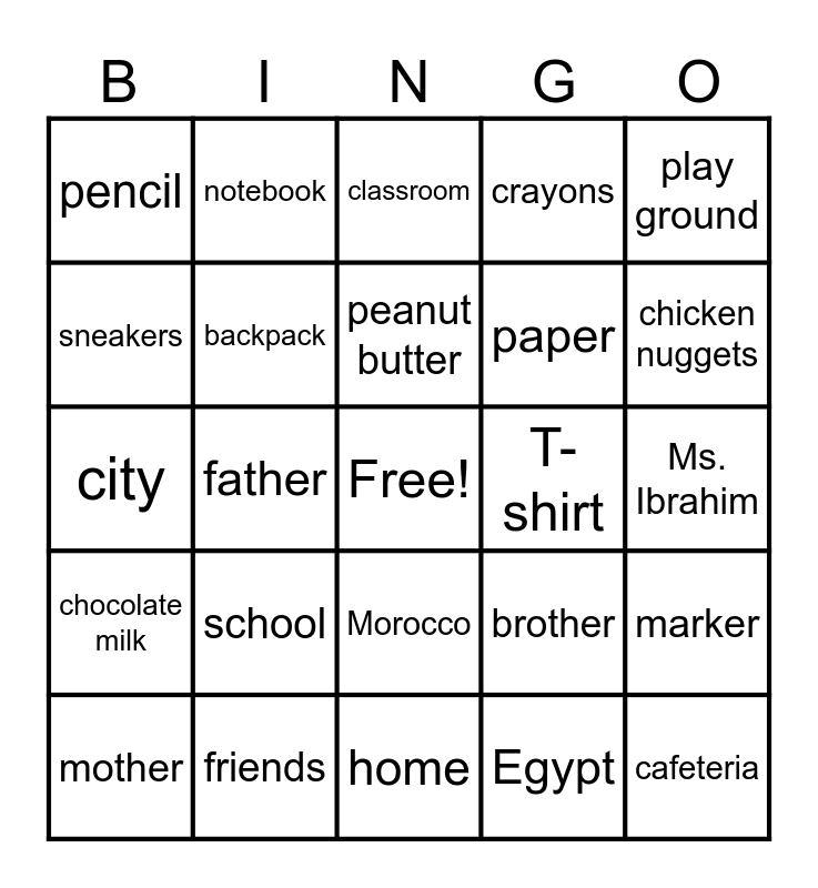 This bingo card has a free space and 24 words: mother, school, peanut butter, Egypt, play ground, pencil, notebook, classroom, T-shirt, Ms. Ibrahim, city, backpack, brother, marker, sneakers, friends, home, crayons, chicken nuggets, chocolate milk, father, Morocco, paper and cafeteria.