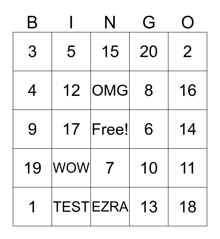 This bingo card has a free space and 24 words: WOW, TEST, OMG, 1, 2, 3, 4, 5, 6, 7, 8, 9, 10, 11, 12, 13, 14, 15, 16, 17, 18, 19, 20 and EZRA.