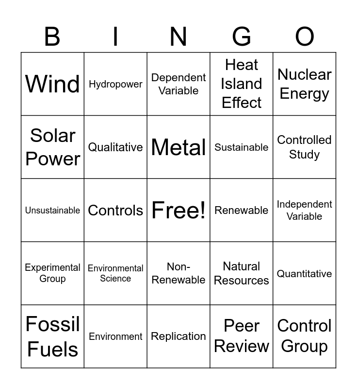 This bingo card has a free space and 24 words: Environmental Science, Environment, Metal, Fossil Fuels, Nuclear Energy, Wind, Solar Power, Hydropower, Renewable, Non-Renewable, Sustainable, Unsustainable, Natural Resources, Quantitative, Qualitative, Peer Review, Independent Variable, Dependent Variable, Controlled Study, Controls, Control Group, Experimental Group, Heat Island Effect and Replication.