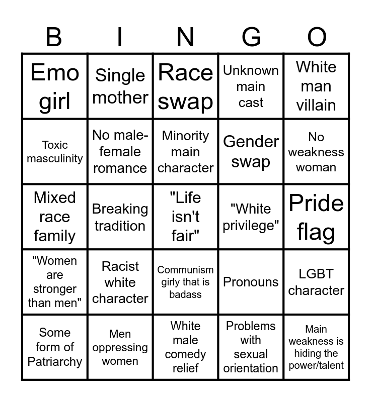 This bingo card has a free space and 24 words: Some form of Patriarchy, Racist white character, Minority main character, Problems with sexual orientation, White man villain, Emo girl, Single mother, Race swap, "White privilege", Pride flag, Mixed race family, No male-female romance, Pronouns, LGBT character, Toxic masculinity, Men oppressing women, White male comedy relief, Unknown main cast, No weakness woman, "Women are stronger than men", Breaking tradition, Communism girly that is badass, Gender swap and Main weakness is hiding the power/talent.