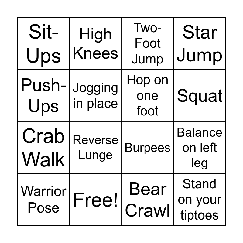 This bingo card has 24 words: Squat Jump, Lunge, Squat, Jumping Jacks, Push-Ups, Sit-Ups, Jogging in place, High Knees, Free!, Toe Taps, Crab Walk, Burpees, Balance on right leg, Plank, Hop on one foot, Skip, Bear Crawl, Two-Foot Jump, Reverse Lunge, Balance on left leg, Warrior Pose, Stand on your tiptoes, Star Jump and Side Shuffle.