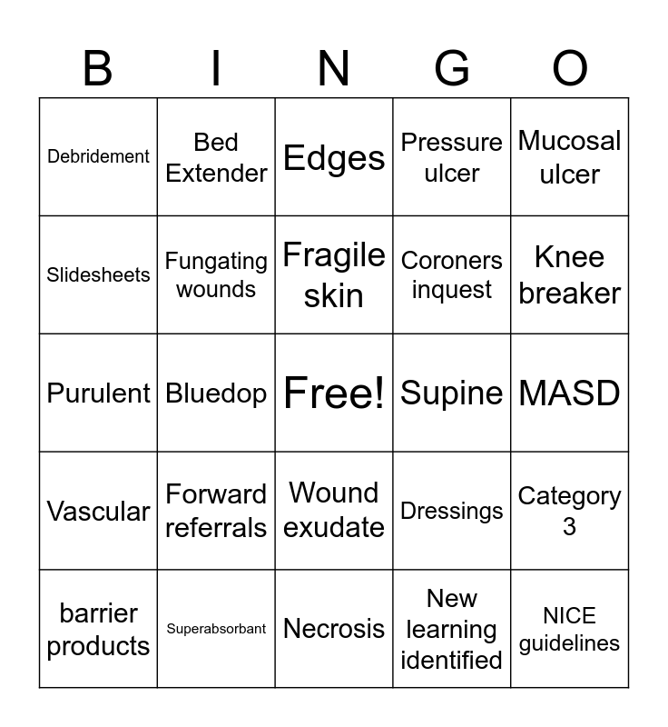 This bingo card has a free space and 89 words: prevention, Reposistion, Wound exudate, Granulation, Safety huddle, Osteomylitis, Medical Photography, Repose foot protectors, Air mattress, Air cushion, AAR, Category 1, Category 3, MASD, Category 2, Fragile skin, Slough, Granulation, TIMES assessment, Category 4, Tissue Viability, Purpose T, Necrosis, Malodour, Purulent, Superabsorbant, Foam dressing, Cerner, Unstageable, Devitalised tissue, Pressure ulcer, Bluedop, Stop! The pressure, Debridement, Safeguarding, Edges, Slidesheets, Offload, Knee breaker, barrier products, Vascular, Boggy, Surrounding Tissue, wound care, Dressings, Supine, Sacrum, Device Related, Bony Prominence, Bed Extender, Incontinence, Nutrition, Flexiseal, Tunnelling, Tissue, Epithilisation, Infection, Inflammation, pain, Elevated CRP, Moisture, Exudate, Highly Exuding, Wound Edges, Rolled, Undermining, Self neglect, Prevention, Best Practice, Forward referrals, NICE guidelines, Body MAP, Wound, Coroners inquest, Fungating wounds, New learning identified, HAPU, CAPU, Senior verification, Device related pressure ulcer, Mucosal ulcer, MRI, Coccyx, AsskinG, Bone Palpable, Ambulant wound clinic, MCA, DOLS and MDT.