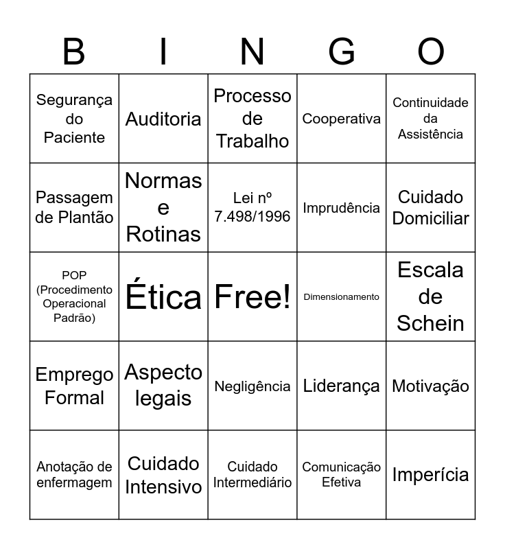 This bingo card has a free space and 24 words: Anotação de enfermagem, Aspecto legais, Lei nº 7.498/1996, Comunicação Efetiva, Continuidade da Assistência, Segurança do Paciente, Auditoria, Processo de Trabalho, Dimensionamento, Escala de Schein, POP (Procedimento Operacional Padrão), Normas e Rotinas, Liderança, Motivação, Passagem de Plantão, Cuidado Intensivo, Cuidado Intermediário, Cooperativa, Cuidado Domiciliar, Emprego Formal, Ética, Negligência, Imprudência and Imperícia.