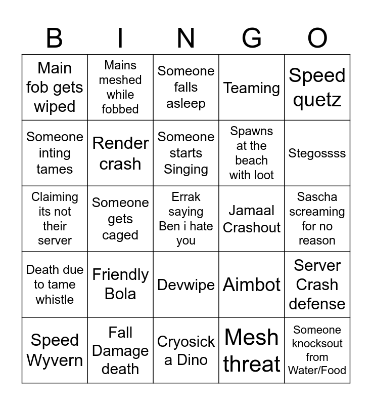 This bingo card has a free space and 24 words: Friendly Bola, Fall Damage death, Someone starts Singing, Speed Wyvern, Speed quetz, Main fob gets wiped, Someone inting tames, Mains meshed while fobbed, Jamaal Crashout, Devwipe, Spawns at the beach with loot, Claiming its not their server, Aimbot, Server Crash defense, Render crash, Mesh threat, Sascha screaming for no reason, Someone falls asleep, Stegossss, Someone gets caged, Someone knocksout from Water/Food, Death due to tame whistle, Teaming and Cryosick a Dino.