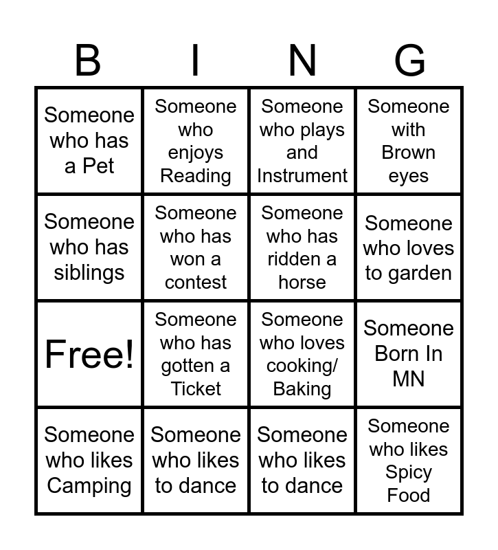 This bingo card has 20 words: Someone Born In MN, Someone Born OUTSIDE MN, Someone who plays and Instrument, Someone who doesn't like coffee, Someone who likes Camping, Someone who has siblings, Someone who likes to dance, Someone who has a Pet, Free!, Someone who enjoys Reading, Someone who has gotten a Ticket, Someone who loves cooking/ Baking, Someone who has won a contest, Someone who likes Spicy Food, Someone who has ridden a horse, Someone with Blue eyes, Someone who loves to garden, Someone with Brown eyes, Someone who likes to dance and Someone who has been to Europe.
