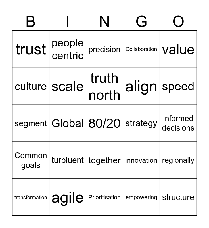 This bingo card has a free space and 24 words: turbluent, agile, truth north, transformation, value, trust, culture, people centric, strategy, together, align, segment, innovation, regionally, scale, empowering, informed decisions, precision, speed, Global, structure, Common goals, Collaboration and Prioritisation.