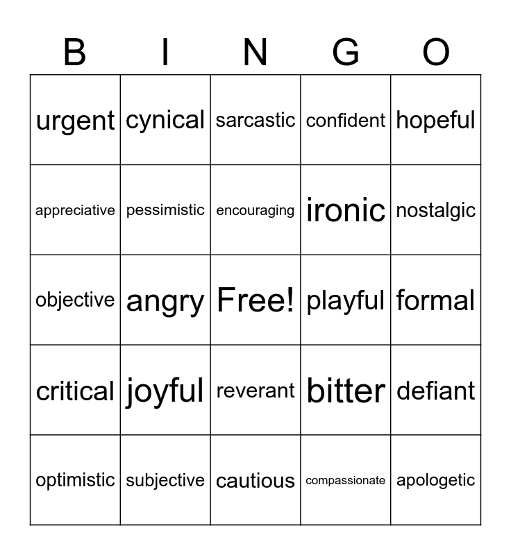 This bingo card has a free space and 29 words: optimistic, humorous, angry, informal, urgent, sarcastic, pessimistic, joyful, playful, subjective, formal, apologetic, cautious, compassionate, nostalgic, serious, reverant, critical, hopeful, objective, bitter, melancholy, ironic, appreciative, confident, cynical, defiant, encouraging and frustrated.