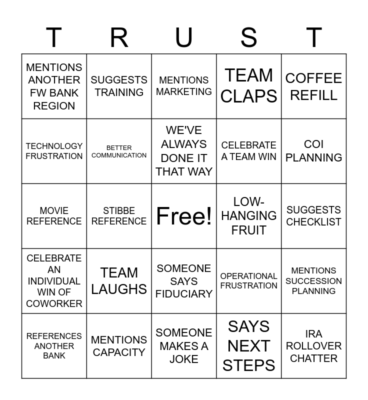 This bingo card has a free space and 24 words: TEAM LAUGHS, MENTIONS CAPACITY, WE'VE ALWAYS DONE IT THAT WAY, REFERENCES ANOTHER BANK, COFFEE REFILL, MENTIONS ANOTHER FW BANK REGION, TECHNOLOGY FRUSTRATION, SUGGESTS TRAINING, LOW-HANGING FRUIT, SOMEONE SAYS FIDUCIARY, CELEBRATE A TEAM WIN, MOVIE REFERENCE, OPERATIONAL FRUSTRATION, MENTIONS SUCCESSION PLANNING, BETTER COMMUNICATION, SAYS NEXT STEPS, SUGGESTS CHECKLIST, MENTIONS MARKETING, COI PLANNING, STIBBE REFERENCE, IRA ROLLOVER CHATTER, CELEBRATE AN INDIVIDUAL WIN OF COWORKER, TEAM CLAPS and SOMEONE MAKES A JOKE.