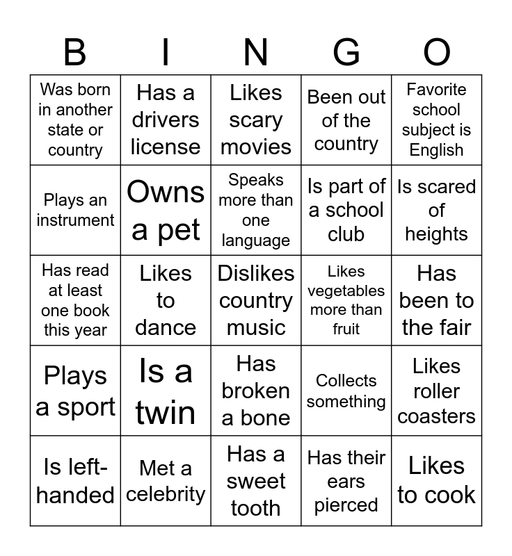 This bingo card has 1 images and 34 words: Has a birthday this month, Favorite color is purple, Has a sister, Owns a pet, Has broken a bone, Been out of the country, Plays an instrument, Favorite food is wings, Speaks more than one language, Likes the beach, Has read at least one book this year, Favorite school subject is English, Is scared of spiders, Was born in another state or country, Likes vegetables more than fruit, Has their ears pierced, Likes to dance, Plays a sport, Dislikes country music, Collects something, Is left-handed, Likes roller coasters, Met a celebrity, Likes scary movies, Is scared of heights, Likes to cook, Has two siblings, Is part of a school club, Has been to the fair, Went to a concert this year, Has a sweet tooth, Is a twin, Has a drivers license and Can do a cartwheel.