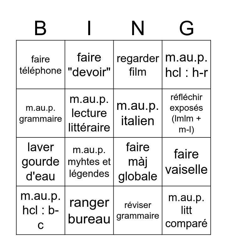 This bingo card has 16 words: ranger bureau, faire vaiselle, regarder film, faire téléphone, laver gourde d'eau, faire "devoir", faire màj globale, réviser grammaire, m.au.p. grammaire, m.au.p. lecture littéraire, m.au.p. hcl : b-c, m.au.p. hcl : h-r, m.au.p. myhtes et légendes, réfléchir exposés (lmlm + m-l), m.au.p. italien and m.au.p. litt comparé.