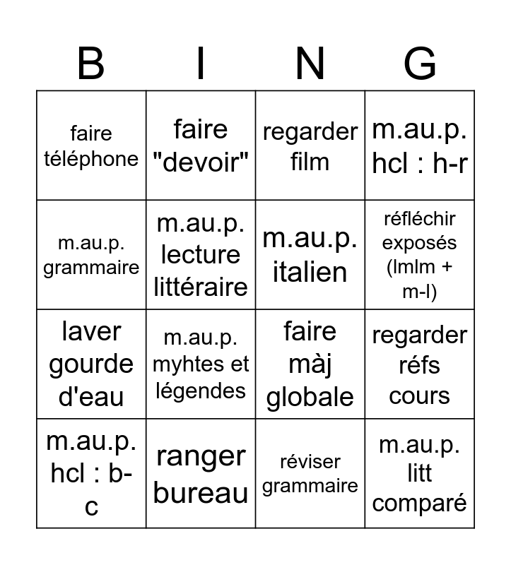 This bingo card has 16 words: ranger bureau, regarder réfs cours, regarder film, faire téléphone, laver gourde d'eau, faire "devoir", faire màj globale, réviser grammaire, m.au.p. grammaire, m.au.p. lecture littéraire, m.au.p. hcl : b-c, m.au.p. hcl : h-r, m.au.p. myhtes et légendes, réfléchir exposés (lmlm + m-l), m.au.p. italien and m.au.p. litt comparé.