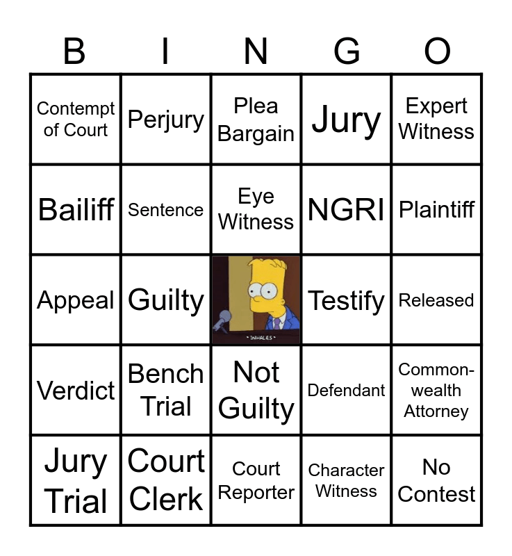 This bingo card has a free space and 24 words: Jury Trial, Bench Trial, Eye Witness, Character Witness, Expert Witness, Contempt of Court, Perjury, Plea Bargain, Testify, Released, Appeal, Sentence, Defendant, Common-wealth Attorney, Bailiff, Court Clerk, Court Reporter, Jury, Plaintiff, Verdict, Guilty, Not Guilty, NGRI and No Contest.