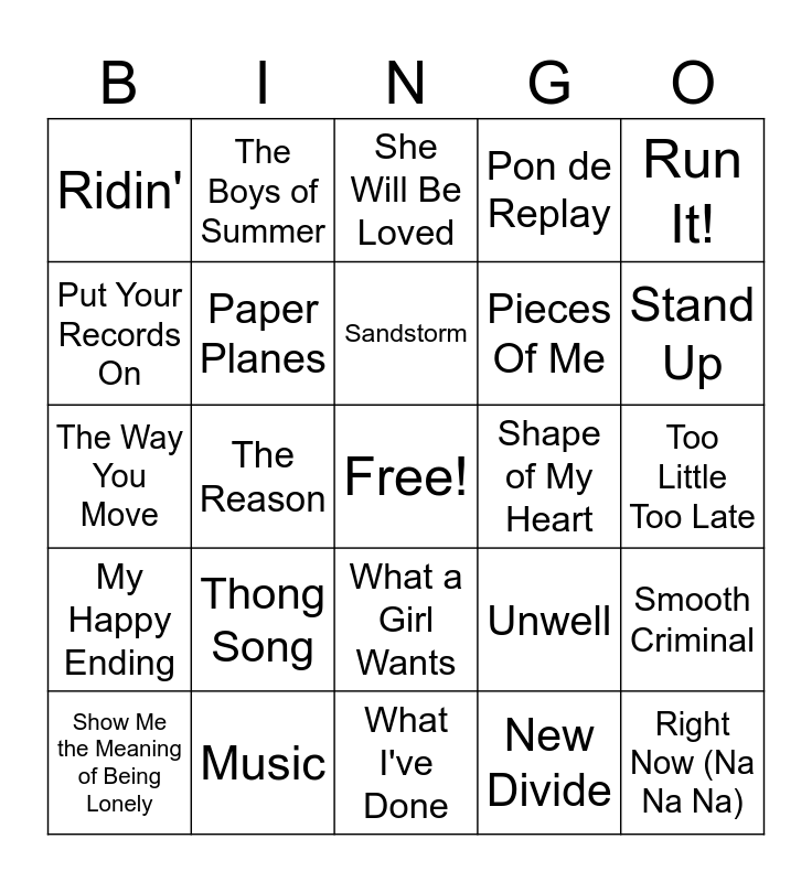 This bingo card has a free space and 60 words: Ms. Jackson, Music, My Band, My Happy Ending, New Divide, Oops!...I Did It Again, Paper Planes, Perfect, Pieces Of Me, Pinch Me, Pon de Replay, Pop Lock & Drop It, Put Your Records On, Rich Girl, Ride Wit Me, Ridin', Right Now (Na Na Na), Run It!, Salt Shaker, Sandstorm, Shape of My Heart, She Will Be Loved, Show Me the Meaning of Being Lonely, Smooth Criminal, Snap Yo Fingers, So Yesterday, Somebody Told Me, Stacy's Mom, Stand Up, Stronger, Suga Suga, Superman, Telephone, Temperature, The Boys of Summer, The One, The Real Slim Shady, The Reason, The Remedy (I Won't Worry), The Way You Move, There You Go, Thong Song, Too Little Too Late, Umbrella, Unwell, Unwritten, Uptown Girl, Use Somebody, Welcome to the Black Parade, What a Girl Wants, What I've Done, What's Luv?, What's Your Fantasy, Whataya Want from Me, Whatcha Say, Wherever You Will Go, Who Let The Dogs Out, Work It, X Gon' Give It To Ya and Your Body Is a Wonderland.