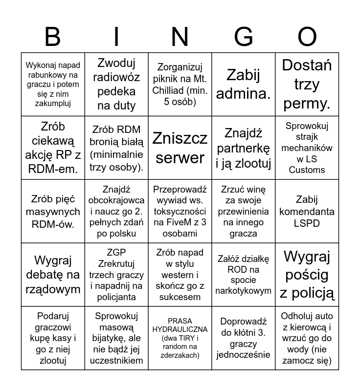 This bingo card has 35 words: Zrób masywnego VDM-a TIR-em., Rozbaw „grubą”, później ją zabij., Zdenerwuj admina., Zrób RDM bronią białą (minimalnie trzy osoby)., Zrób napad w stylu western i skończ go z sukcesem, Zabij admina., Zrób ciekawą akcję RP z RDM-em., Potrąć kogoś samolotem (inscenizacja)., Zniszcz serwer, Zrób pięć pojedynczych RDM-ów RP., Zrób pięć masywnych RDM-ów., Dostań trzy permy., Ragebait na kastiego, Zrób beczkę dowolnym SUV-em z randomem na pasażerce, Wykonaj napad rabunkowy na graczu i potem się z nim zakumpluj, Zrzuć winę za swoje przewinienia na innego gracza, Doprowadź do kłótni 3. graczy jednocześnie, Znajdź obcokrajowca i naucz go 2. pełnych zdań po polsku, Wygraj debatę na rządowym, Przeprowadź wywiad ws. toksyczności na FiveM z 3 osobami, Załóż działkę ROD na spocie narkotykowym, Podaruj graczowi kupę kasy i go z niej zlootuj, Wygraj pościg z policją, Sprowokuj masową bijatykę, ale nie bądź jej uczestnikiem, Zorganizuj piknik na Mt. Chilliad (min. 5 osób), Sprowokuj strajk mechaników w LS Customs, Odholuj auto z kierowcą i wrzuć go do wody (nie zamocz się), STREAK 3 BW in ONE DM (deathless), Znajdź partnerkę i ją zlootuj, Zabij komendanta LSPD, Zgnieć randoma dachem samochodu, PRASA HYDRAULICZNA (dwa TIRY i random na zderzakach), ZGP Zrekrutuj trzech graczy i napadnij na policjanta, Zwoduj radiowóz pedeka na duty and Miej za sobą w pościgu przynajmniej 3 radiowozy.
