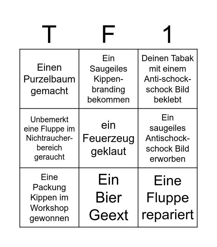 This bingo card has a free space and 14 words: In den Aschenbecher geschissen, Zwei Kippen mit jemand anderem geteilt, Eine Packung Kippen im Workshop gewonnen, Ein Saugeiles Kippen-branding bekommen, Unbemerkt eine Fluppe im Nichtraucher-bereich geraucht, Eine Fluppe repariert, Rauch_dich_geil auf Insta reingefolgt, Ein Bild oder Video vom Workshop an @drop.zeitschrift geschickt, Ein Bier Geext, Einen Purzelbaum gemacht, Mit jemand anderem das T-shirt getauscht, Ein saugeiles Antischock-schock Bild erworben, Deinen Tabak mit einem Anti-schock-schock Bild beklebt and eine Zigarette gekaut.
