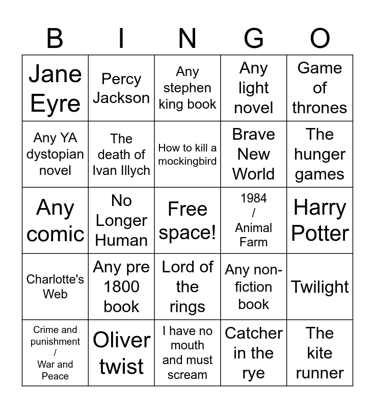 This bingo card has a free space and 24 words: Any pre 1800 book, Oliver twist, How to kill a mockingbird, Crime and punishment / War and Peace, Game of thrones, Jane Eyre, Any YA dystopian novel, Percy Jackson, 1984 / Animal Farm, Lord of the rings, Brave New World, Any comic, Any non-fiction book, Twilight, The death of Ivan Illych, Catcher in the rye, Harry Potter, Any stephen king book, The hunger games, No Longer Human, The kite runner, Charlotte's Web, Any light novel and I have no mouth and must scream.