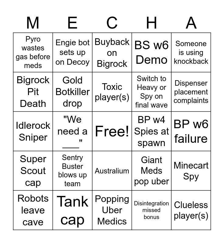 This bingo card has a free space and 24 words: Sentry Buster blows up team, Tank cap, Toxic player(s), Robots leave cave, Someone is using knockback, Pyro wastes gas before meds, Bigrock Pit Death, Engie bot sets up on Decoy, BP w4 Spies at spawn, Australium, Switch to Heavy or Spy on final wave, Idlerock Sniper, Giant Meds pop uber, Minecart Spy, Gold Botkiller drop, Disintegration missed bonus, BP w6 failure, Buyback on Bigrock, Dispenser placement complaints, "We need a ___", Clueless player(s), Super Scout cap, BS w6 Demo and Popping Uber Medics.