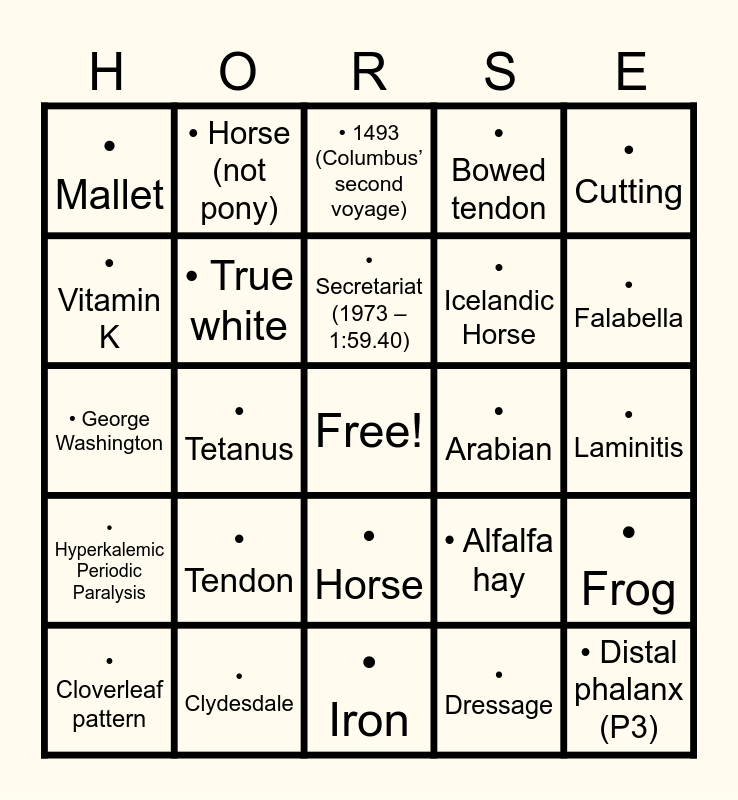 This bingo card has a free space and 30 words: • Clydesdale, • Biotin (B-vitamin), • Tetanus, • Hock joint, • Mallet, • 1493 (Columbus’ second voyage), • True white, • Horse, • Arabian, • Iron, • Laminitis, • Distal phalanx (P3), • Dressage, • Barbaro, • Falabella, • American Quarter Horse, • Alfalfa hay, • Hyperkalemic Periodic Paralysis, • Tendon, • Cutting, • George Washington, • Bald face, • Horse (not pony), • Icelandic Horse, • Vitamin K, • Bowed tendon, • Frog, • Cloverleaf pattern, • Secretariat (1973 – 1:59.40) and • Bay.