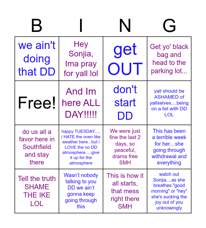 This bingo card has 16 words: Wasn’t nobody talking to you DD we ain’t gonna keep going through this, This has been a terrible week for her…she going through withdrawal and everything, get OUT, we ain't doing that DD, do us all a favor here in Southfield and stay there, Hey Sonjia, Ima pray for yall lol, We were just fine the last 2 days, so peaceful, drama free SMH, This is how it all starts, that mess right there SMH, Free!, And Im here ALL DAY!!!!!, Tell the truth SHAME THE IKE LOL, Get yo' black bag and head to the parking lot..., happy TUESDAY..... i HATE the oven like weather here...but i LOVE the no DD atmosphere.....give it up for the atmosphere, yall should be ASHAMED of yallselves....being on a list with DD LOL, don't start DD and watch out Sonjia....as she breathes "good morning" or "hey" she's sucking the joy out of you unknowingly.